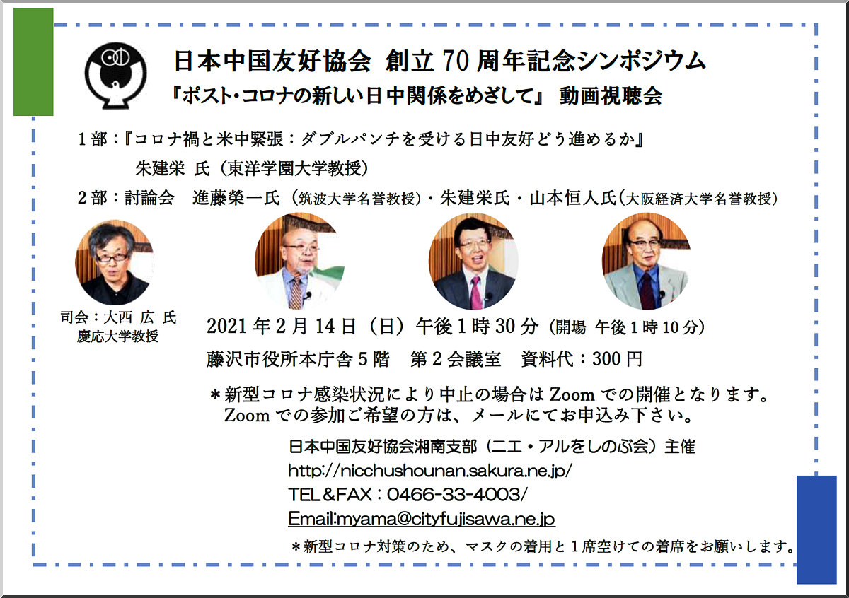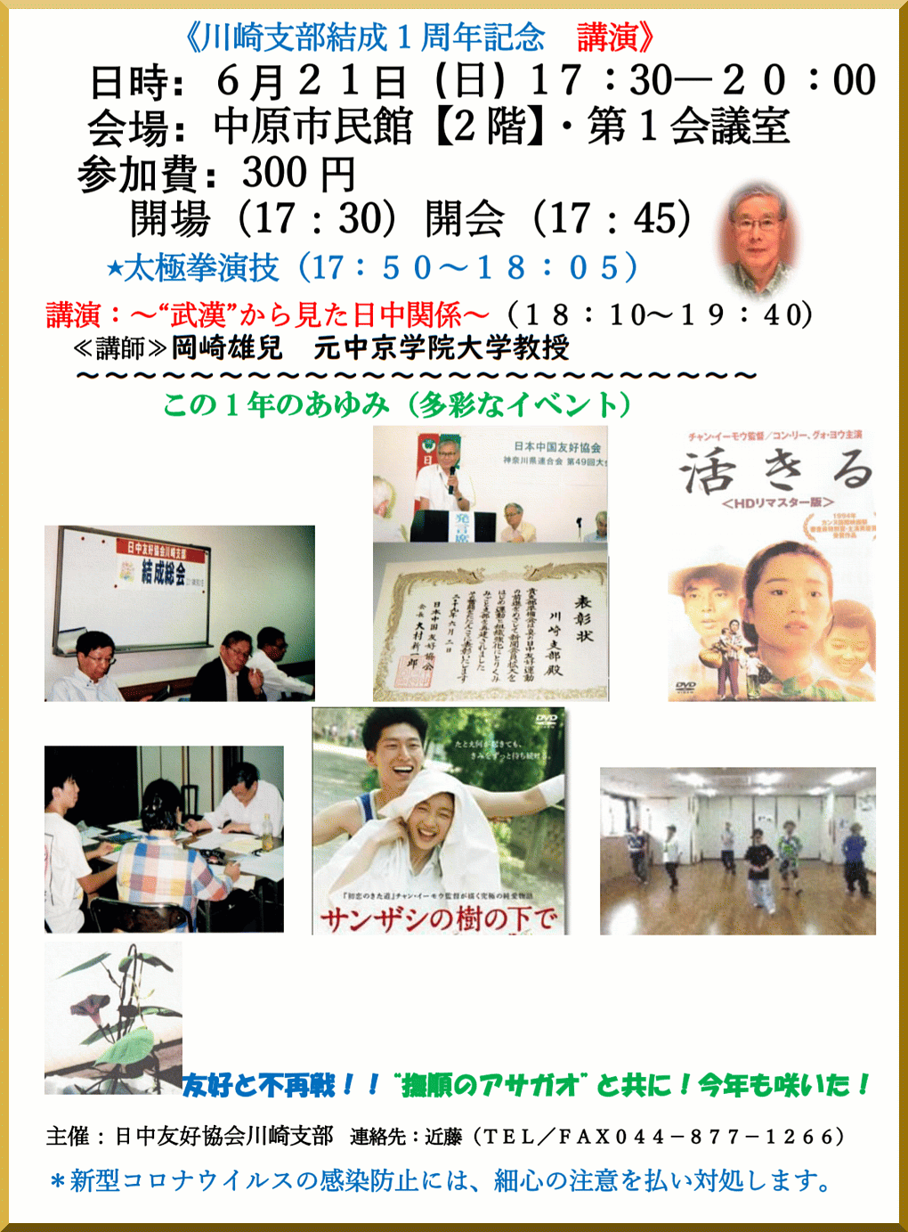 県央支部 講演会 「武漢から見る日中関係」 川崎支部 一周年記念講演会 「武漢から見た日中関係」 |