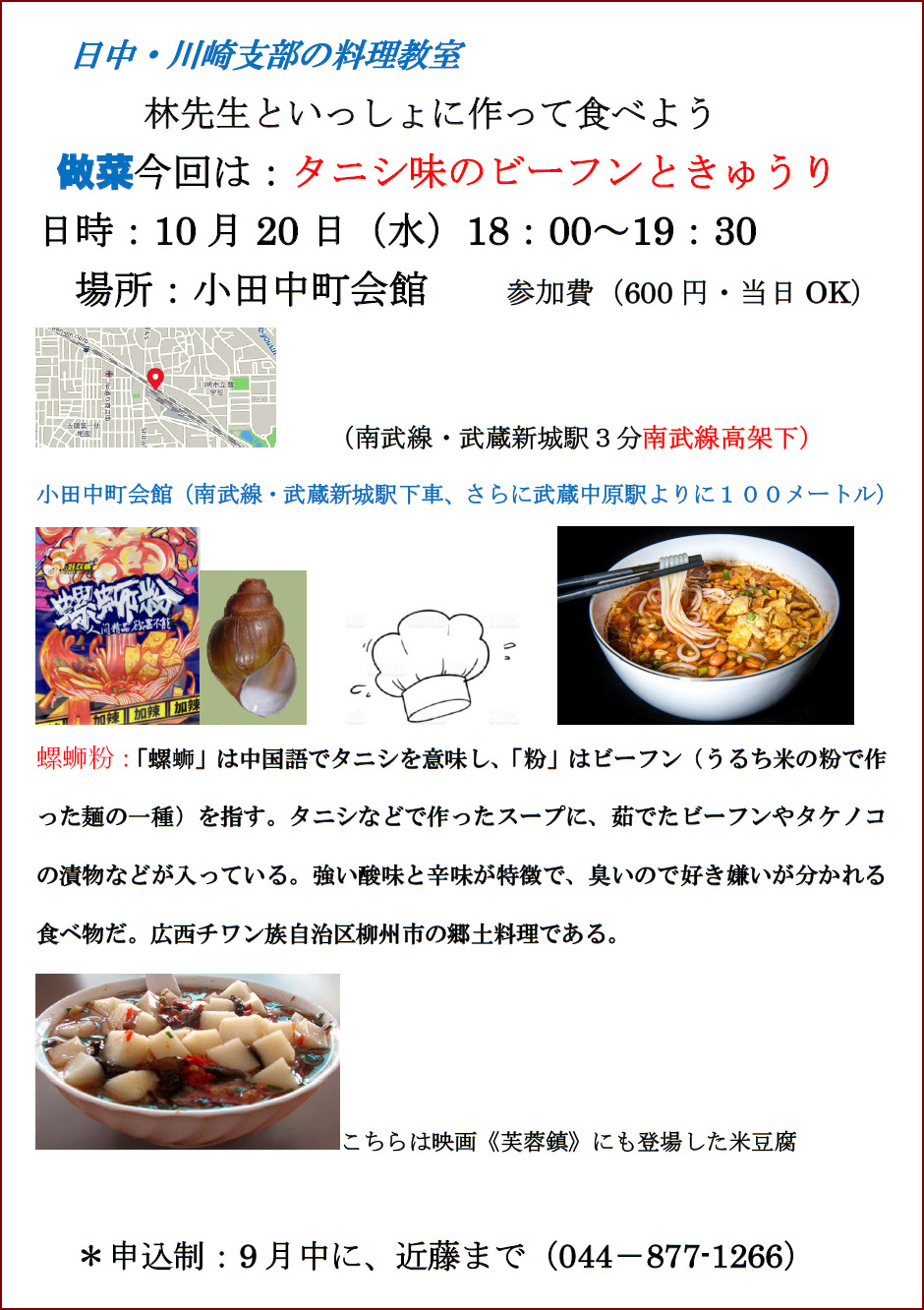 川崎支部 料理教室 「タニシ味のビーフンときゅうり」 |
