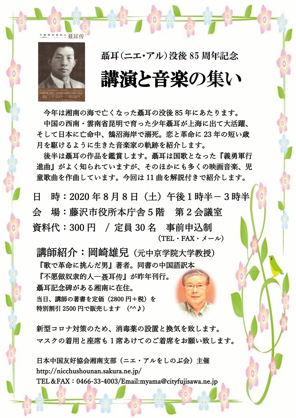 湘南支部 聶耳(ニエ・アル)没後85周年記念 「講演と音楽の集い」 |